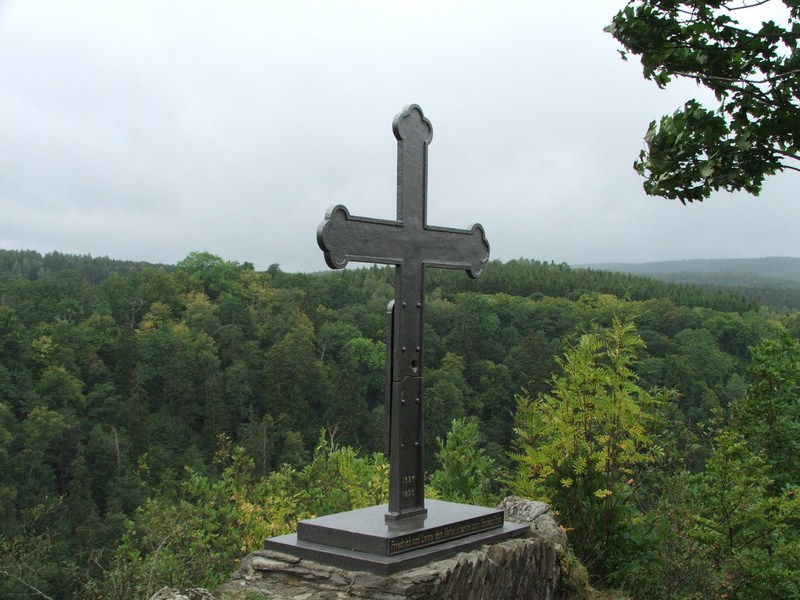 Eine uralte Bank taucht auf. Das Untergestell aus runden Eisenstangen, die darauf liegende Eichenbohle verwittert, mit je zwei Vierkant Schrauben, links und recht, fest verbunden. Seit über 100 Jahren soll sie schon unverändert hier ihren Platz haben. Hergestellt in der Mägdesprunger Gussfabrik. Etwas weiter ein geflicktes Eisernes Kreuz, auch dort entstanden. Im letzten Krieg von einem Geschoss getroffen, zerbrochen und verschwunden, tauchte es 1994 nach einem Hochwasser in der Selke wieder auf. Geborgen, renoviert, 1995 wieder aufgestellt. Am heutigem Volkstrauertag eine Ansprache und ein Gedenken wert. Etwas höher, versteckt die Mägdetrappe, ein Felsen mit zwei großen Fußabdrücken, die der Sage nach das Riesenweib Amala vom Ramberg beim Sprung über das Tal, zu ihrem Geliebten, hinterlassen haben soll. Eine andere Geschichte sagt, der Sprung sollte zur Freundin am gegenüber liegenden Ufer führen, sie zögerte jedoch vor der Weite. Ein pflügender Bauer lästerte über ihr Zögern. Das reizte sie so sehr, das sie den Bauern samt Pflug und Pferd in ihre Schürze packte und mit einem Satz über das Tal zu ihrer Freundin sprang. Beim Aufsprung rutschte ein Schürzenzipfel aus ihrer Hand. Das bäuerliche Gespann machte sich während der Begrüßung der beiden Riesendamen schnell davon. Er erzählte sein Erlebnis seiner Frau und diese brachte es dann unter die Leute.