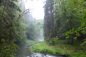 Morgens ist die Welt grau. Feuchter Nebel zieht über die Zeltwiese. Schlapp und nass unser Außenzelt. Beim Herauskrabbeln aus unserm Zelt gibt es nasse Knie. In der Apsis drückt das Regenwasser der Zeltwiese durch unsere Zeltunterlage, einer schwarzen Bändchenfolie die sonst zur Unkrautunterdrückung auf Beeten im Gartenbau Verwendung findet. Es gibt nicht nur nasse, sondern auch schmutzige Knie. Die Rasennarbe ist nicht so dicht, so fest wie gedacht. Die aufgelöste feuchte Bodenkrume drückt sich, mit dem Wasser vermischt, durch die feinen Öffnungen der Folie. Entsetzt über den Schmutz und Dreck, der in den weiblichen Sanitärräumen herrscht kommt Rita von der morgendlichen Toilette wieder. "Diese Wirtschaft ist unbegreiflich. Das ist eine Zumutung" schimpft sie. Schnell kocht das Kaffeewasser. Frühstück auf feucht-grüner Wiese. Bald sind wir auf dem Weg zur Wilden Klamm der Kamenice.