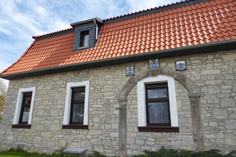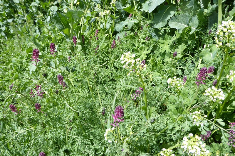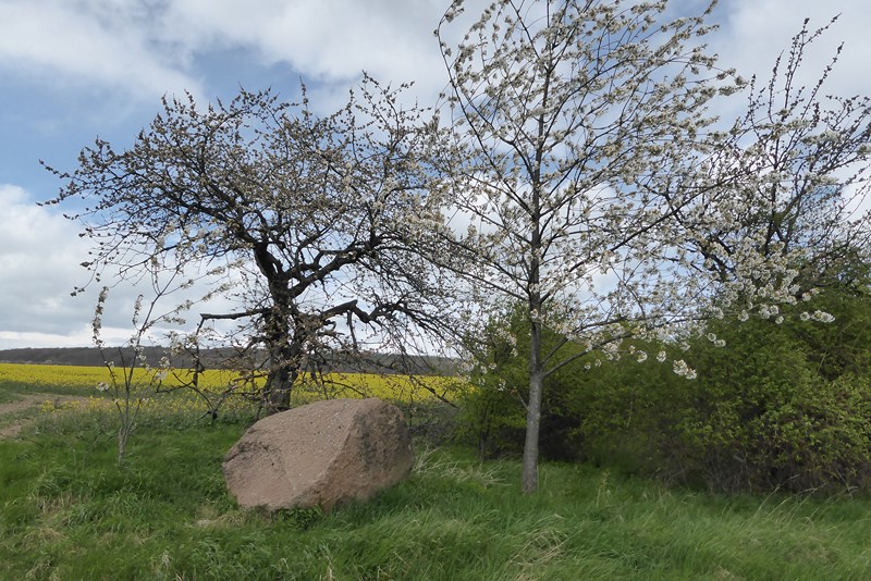 Lilablau schimmert die Frühlings-Platterbse verstreut aus dem braun der vorjährigen Buchenblätter. Am Steinberg, der Wald springt hier nach Süden vor, steht ein sehenswerter Grenzstein. Ein heraus gearbeitet gleichschenkeliges Kreuz, das "Eiserne Kreuz" schmückt zwei seiner Seiten. Wir folgen dem Weg ins Tal, stoßen auf "Via Romea", den Weg von Stade nach Rom. Folgen dem durch die Felder in Richtung "Langerberg" nach Sargstedt. Vom Sportplatz schallt der Lärm der Fußballer herauf. Links lockt der Taubenberg mit seinen Frühlings-Adonis. Das "Dreizähnige Knabenkraut", Orchis tridentata auf seinem Hügel wird noch nicht blühen. Für Heute verzichten wir daher auf den kleinen Umweg ihn aufzusuchen. Wandern an der Kirche vorbei durch den Ort. Auf der Wegkreuzung wo der Weg hoch zum Warteturm abzweigt, wandern wir weiter stramm in Richtung Westen. Noch ein paar hübsche Baugrundstücke links und rechts und schon sind wir wieder in der freien Landschaft der Felder und Äcker. Ein riesiger Findling rechts des Weges am unteren Teil des ersten Gebüschstreifens das sich vom Hang herunter durch die Felder zieht, zeigt, dass wir auf den richtigen Weg sind. Der verliert sich weitgehend je weiter wir uns Aspenstedt nähern. Er wird zu einem schmalen Pfad der zu einem Hochsitz, an diesem vorbei uns auf den Weg bringt der von unten, vor den Kirschhainen herauf kommt. Ab jetzt ist der weitere Weg als grasbewachsener Feldweg vorgegeben, Aspenstedt nicht mehr zu verfehlen. Gehen wir gedanklich noch einmal zurück auf unseren fast weglosen Marsch durch die Felder, betrachten wir das Gesehene. Mitten durch den gelbstrahlenden blühenden Raps sind wir gelaufen. Immer mit Blick auf den Harz, seinem Vorland, auf Halberstadt mit seinen Türmen, den Spiegelsbergen, dem Hoppelberg. Nicht nur der duftende Raps war unser Begleiter, nein auch verschiedene Ackerunkräuter die dem scharfen giftigen Strahl der "Rapspflegemittel" entgangen sind kommen oder blühen an seiner Feldkante. Hoch gewachsen, noch in Knospe die Besenrauke mit filigranen hellgrünen Blättern. Der Erdrauch bringt samtene Rottöne ins Bild, umrankt die aufstrebenden Stängel des weißblühenden Ackerhellerkrauts. Auf einer kargen, unbewachsenen Feldfläche leuchtet ein rotes Mal herauf. Ich kann es nicht einordnen, tippe auf einen kriechenden Hahnenfuß der sich hier breit macht, die kahle Erdfläche bald begrünen wird. Daneben zeigt der Persische Ehrenpreis seine blauen unsymmetrischen Blütenscheiben. Noch im verhaltenen Wachstum mischt sich die Rote Taubnessel dazwischen. Bald wird sie hier ihre Dominanz aufgebaut haben, den Ehrenpreis in seine Schranken gewiesen haben. Kurz vor Aspenstedt eingezäunte Reihen von Obstbäumen. Schön in Reih und Glied stehen sie. Das frische Gras ist zwischen den Baumreihen sauber abgemäht. Zwischen den Obstbäumen strahlen die gelben Blüten des Löwenzahns um die Wette. Noch nicht alle Reihen der Obstbäume blühen. Manche ihrer Sorten halten sich noch zurück, trauen noch nicht den warmen Strahlen der Sonne. Fürchten sich vor den kalten Nächten die immer noch Frost bringen können. Der Kirchturm von Aspenstedt duckt sich in die weißen und rosa Blüten der japanischen Kirschen. Über den Harz zieht ein Wolkenschleier, verdeckt die Sicht auf den Brocken. Aus dem blauweißen Himmel wird zunehmend ein Grauer. Auch der Erbsen-Sämann ist aus seinem Garten verschwunden. Ein Drahtgitter schützt seine Erbsen vor den lärmenden Spatzen. Die drei Wappenschilder an einem neugestalteten aus Kalksteinen erbauten alten Landhauses mit einem Fenster im zugemauerten Torbogen birgt ein neues Rätsel. Es gibt halt viel zu sehen, zu ergründen in dem vorgelagerten Hügel im nördlichen Vorharz. Einem Hügel mit seltsam eigenartigen Namen, dem Huy.