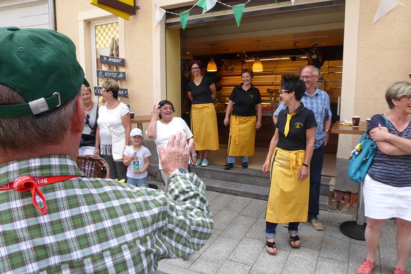 Als der Umzug durch die Straßen wandert bleibt das so. Überall wird kräftig gewunken, geklatscht. Handy und Kamera von großen und kleinen Sebnitzern, der Angereisten klicken. Halten in Bildern fest was Sebnitz heute erlebt. Niemand arbeitet, selbst die Cafe's sind bedienungslos. Die Verkäuferinnen stehen vor der Türe, spenden den Durchziehenden ihren Beifall, dem bunten Wurm der Wanderer mit ihren Wimpelstöcken, Wimpelbändern. Zum Schluss des Umzugs fotografiert dann eine Gruppe die andere Gruppe, geht dem noch marschierendem Zug entgegen. Bunt, bunt ist das Treiben auf den Straßen von Sebnitz. In einem Garten mit Bronzebrüsten finden wir eine Bank im Schatten. Sind gerade noch rechtzeitig eingetroffen. Jugendliche Rabauken versuchten gerade die Latten der Bank einem anderen Verwendungszweck zuzuführen. Mit einer abgerissenen Latte machen sie sich auf und davon. Ein paar Musikstücke der Sächsischen Blasmusikanten auf der Festmeile hören wir uns noch an dann lockt uns die Ruhe in Mittelndorf. Der Abend im "Weinberg" bringt den müden Füßen Erholung. Ein gutes Essen, das dazu gehörende Bier, füllt die verbrauchte Energie wieder auf.