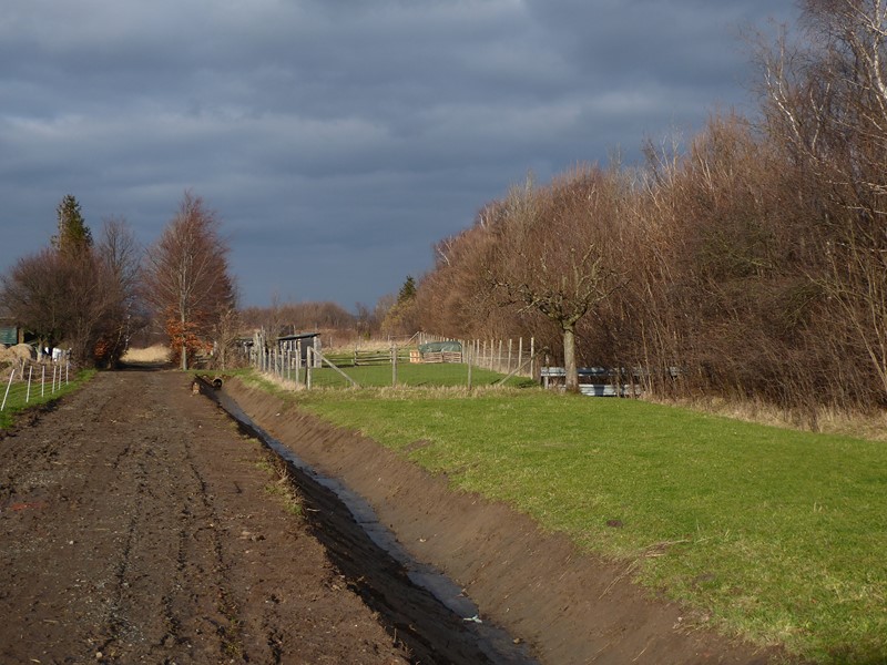 Ganz so schlimm wird es dann doch nicht. Leicht abgetrocknet, ist er zwar holperig und rutschig und es ist mehr ein Stolpern als ein Laufen, das mir bevorsteht. In einem ausgebaggerten tiefen V-Einschnitt plätschert das Grabenwasser, glänzend im Sonnenschein, in seinem erdigen neuem Bett. Kein Grashalm, kein Pflänzlein, kein Strauch, kein kleiner Kolk gibt dem Fließenden Ruhe und Schutz, Leben. Tot strömt sein Wasser dahin, verschwindet in einem Betonrohr. Die Schrebergärten sind, bis auf zwei, aufgegeben. Ihre Gartenhäuser zerfallen. Oben auf der Schnellstraße tobt der Verkehr. Gleich hinter der Straßenbrücke weist ein geschnitztes Schild den Weg nach Bad Harzburg. Folge dem Wiesenweg östlich der B4. Westerode im Sonnenschein. Bald hinter der Bahnbrücke Harzburg - Wernigerode, die Strecke ist schon seit der Teilung Deutschland in Ost und West aufgegeben. Nach der Wiedervereinigung verworfen, die Schienen entfernt. Nur die hohe Brücke über dem tiefen Einschnitt in das "Horn", der nord-westlichen Verlängerung des Butterbergs, ist geblieben. Gleich hinter dieser Brücke beherrschen jetzt die Schlehen den Weg. Kein Durchkommen. Ein Feldweg bringt mich auf den Harzburger Ringweg, der sich im Tal hoch zum Butterberg zieht. Hier gleich auf der ersten Bank wird im Sonnenschein gerastet, meine Wegzehrung, mein Apfel gegessen. Nicht mehr weit, knapp 2km noch nach Hause. Genieße den Blick auf unsere Harzer Berge, auf Sachsen-, die Burgberge, dem Ettersberg. Ganz hinten im Süden, die Sendemasten von Torfhaus. Der Brocken trägt eine Wolkenkappe.
