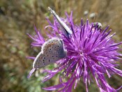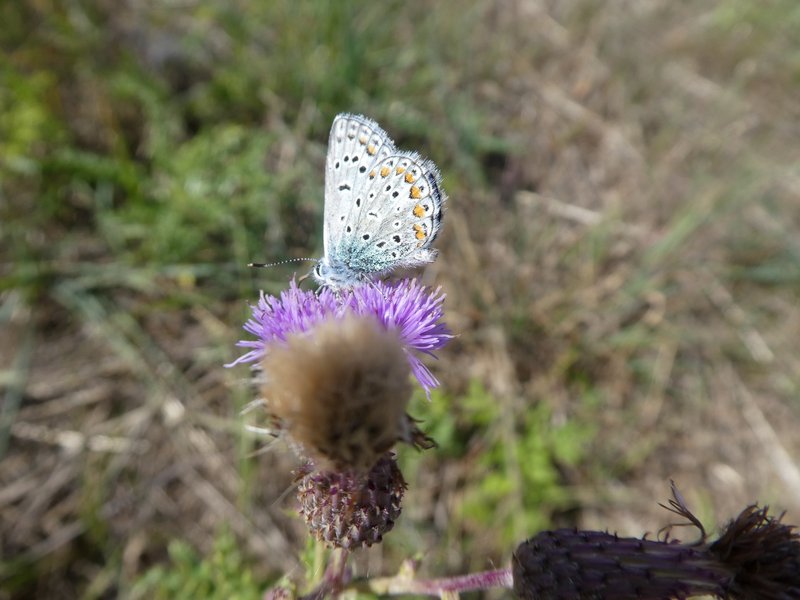 "Wenn du hier starten willst, dann musst du erst die benutzten Tempos, den ganzen Dreck der hier umher liegt erst einsammeln. Das ist ja so schweinisch hier, dass mir das Essen von der vergangenen Woche noch hoch kommt" der Spruch meiner Lieben als wir die Stufen oberhalb des Parkplatzes am Blauen See erstiegen haben, auf schmalem Pfad zum Blauen See wandern. Ganz unrecht hat sie nicht, doch da verlangt sie etwas zuviel von mir. Auf jeden Fall stößt der umherliegende Dreck auch mich nicht minder ab und trübt die Wanderfreude erheblich. Am See wird es bestimmt besser werden und die Freude am Betrachten des blauen Wasser die trübe Stimmung vertreiben. So ist es auch, obwohl sein Wasser von blau ins grün gewechselt und deutlich weniger geworden ist. Wir wandern am trockengefallenen Abfluss entlang zum Garkenholz. Wollen auf dem verschwiegenem Weg hoch zum Schornsteinberg. Von Verschwiegenheit nicht mehr die Spur! Breitgeschoben zum Holztransport hergerichtet, seiner Vegetation beraubt, bringt er uns in langen schottrigen zerfahrenen Schleifen in die Höhe. "Lass das sein mit deiner Wanderung hier, plane sie um, die hier kannst du vergessen" meldet sich Rita zu Wort. Sie hat ja recht mit ihrer Kritik. Auch mir kommen Zweifel. Der Schornsteinberg empfängt uns freundlich. Schön ist es hier und auf den Wiesen stehen dicht gedrängt die Blüten der Herbstzeitlosen. Laufen weiter zu den Enzianen an der Abraumhalde. Fleißige Leute haben den Enzianstandort, wie jedes Jahr gemäht, das Mähgut abgeräumt, den Enzianen Platz gemacht. Alles perfekt, nur die rötlich-violetten Blüten des Deutschen Enzian lassen auf sich warten. Nicht ein Fümmelchen ist von ihnen zu finden! Meine Stimmung total im Eimer, meine Wanderung auf der Kippe. Als wir dann noch auf breiten, staubigen Kalkschotter des Fahrweges, in nun sommerlicher Hitze, an abgeernteten Äckern Richtung Hüttenrode zurück zum Blauen See laufen, ist unsere Stimmung nicht sehr freundlich. Rita schimpft und ich suche verzweifelt den Ackerrand nach irgendwelchen Besonderheiten die ich bei meiner Wanderung zeigen könnte ab. Finde rein gar nichts was Interesse wecken könnte. Erst als wir nach rechts abzweigen,ein grüner Fahrstreifen uns aufnimmt, erhellt sich die Stimmung wieder. Letzte Blüten von Wiesen-, von Skabiosen- und Perückenflockenblumen, von Ackerkratzdisteln tauchen auf und mit ihnen auch ihre Besucher, die Hauhechelbläulinge. Streiten sich oft zu mehreren wer den besten Platz auf einer dieser Blüten behauptet. Der Feuerfalter der sich auf dem nachgewachsenen grasgrünen großen Horst des Rainfarn, der seine gelben Knopfblüten in die Sonne reckt, da schon einfacher. Er wird von den zahlreichen Blauen mit ihrer punktierten Unterseite nicht bedrängt. Ist es die Farbe oder der Geschmack des Nektar der diese Auswahl regelt, oder nur der Zufall? Wie auch immer, dieses bunte Leben bringt die Waagschalen des Erlebens wieder zur Seite des Glücks. Ein Apfel auf der Bank am Schienenstrang der Rübelandbahn. Kein Zug rattert vorbei, nur die Gedanken kreisen um die Wanderung am kommenden Sonntag. "Du kannst ja machen was du willst, aber mich lockst du nicht wieder in diese Trockenheit mit den verbrannten Wiesen, dem Staub, der Hitze, den Steinen auf die breiten langweiligen Wege. Ich bleibe zuhause auch wenn die Weite der Wiesen, die Ausblicke noch so schön sind. Eben ist es einfach trostlos!" Der Entschluss meiner Lieben. Ich hadere. Drei harzweinende Fichtenzapfen am Weiterweg zum Auto setzen meiner Grübelei ein Ende. Ich starte mit Kuno, der die Wiesen hier oben besser kennt als ich, einen weiteren Versuch vom Eggeröder Brunnen, lasse Blauen See und Garkenholz weg und starte von der Höhe. So werde ich es machen.
