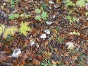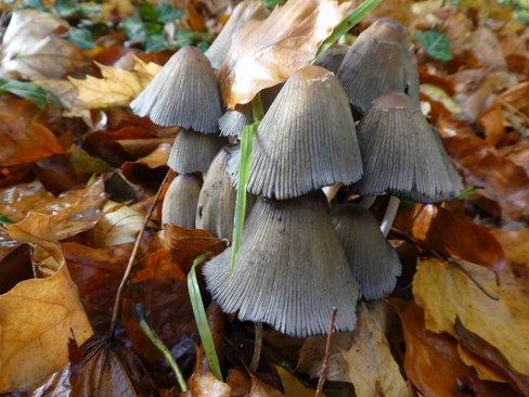 Auf einer schon lange liegenden, im Vergehen befindlichen, Rotbuche überzieht der Phlebia radata, der Orangerote Kammpilz das tote Holz mit seinen krustigen leuchtenden Fruchtkörper. Der Feld-Schwindling / Marasminus oreades vor einer Aussichtsbank mit Aussicht auf die Stadt, soll zwar ein guter Speisepilz mit Bittermandelgeschmack sein. Traue mich aber nicht ihn zu testen. Fotografiere ihn lieber als ihn in der Pfanne zu braten. Man braucht ja auch nicht alles in sich rein zu stopfen, vor allem wenn schon ein paar vorbei kommende Hunde an ihm geschnüffelt und anderes erledigt haben könnten.
