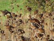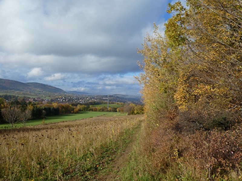 Der Blick von hier über die Koppeln in Richtung Göttingerode mit dem spätherbstlichem Blattschmuck der Laubbäume, von dem sich die dunkelgrünen Fichten im Vorder- und weit im Hintergrund am Rand der Berge, mit ihrem dunklem Grün, die Wiederkehr des Sommers versprechen, sind schon eine wohlschmeckende, sättigende Speise für die Seele.