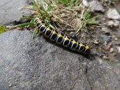 Das macht pure Freude. Die kleinen weißen Blüten des Augentrost mit ihrer gelben Mitte, die die stahlblauen längs gestreiften, übereinander liegenden Blüten des Schwalbenwurz Enzian die, dem sich langsam ins rot wechselnden, Heidelbeerkraut ein besonderes Flair verleihen. Die grünen kurzen Zweige der in den Weg ragende kleinen Fichten, die braunen Fruchtkörper der grünen Moose, dem Frauenhaarmoos, die stabilen kurzen Triebe der Europäische Teufelsklaue, auch Tannenbärlapp genannt; alle diese Schönheiten findet man neben dem steinernen Pfad. Nicht von mir zu bestimmen ist eine sich kringelnde dicke schwarzweiß geringelte Raupe mit gelben Dreiecken die sich über der gesamten Rückenlinie hinziehen. Welcher Falter vertraut, hebt, mit solch einer auffälligen bunten Raupe, die Überlebenschancen seiner Nachkommen?