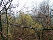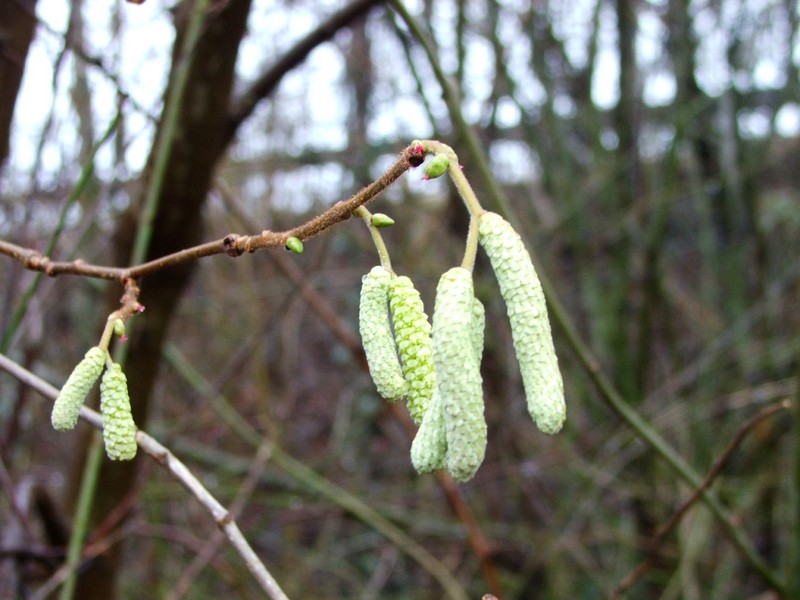 Wir überschreiten die Radau beim Bündheimer-Schützenhaus, steigen den Hohlweg hoch, erreichen den Ackerrand. Rechts neben uns die B4. Der Wildzaun, der Rehe und auch andere Tiere von der Fahrbahn fernhaften soll, ist auf langen Strecken von der Waldrebe überwachsen. Zahlreiche, vorjährige Vogelnester sind in den blattlosen Ranken sichtbar. 34 Nester zähle ich bis zur Unterführung. Graffiti Künstler haben ihre Bilder an die Brückenwände gesprüht. Hinter der Brücke Haselsträucher, ihre gelben Kätzchen baumeln schon im Wind. Die kleinen roten weiblichen Blüten geöffnet, bereit den Pollenstaub aufzufangen. Doch heute ist nichts mit Pollensammeln, bei dieser Nässe bleiben die Pollen in ihren Kammern, warten auf besseres Flugwetter. Folgen dem Harzburger Ringweg, der uns über den Kamm des Butterberges leitet.