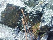 Die anschließenden Hornfels Felsen sind mit Flechten überzogen. Weitgehend finden wir hier Nabelflechten, die haben nur einen Festpunkt in der Mitte als Halt. Doch auch Krustenflechten. Krustenflechten liegen fest auf ihrer besiedelten Oberfläche an, ablösen lassen sie sich nicht. Nur mit ihrer Zerstörung kann man sie vom Gestein lösen..