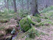 Wir treten ein in die Berge. Links der Elfenstein, rechts der Gläseckenberg. Das Tal dunkel, im Schatten. Kühler Wind bläst entgegen. Bald taucht rechts des Weges ein zugewachsener Quarzsteinbruch auf. Die Grundlage der hier vergangenen Glasherstellung? Stöbere drin umher. Finde nichts besonderes. Ein vergehender Birkenstamm mit der "Zerfließenden Gallertträne" ist das einzige Interessante.