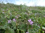 Exodium cicutarium -- Reiherschnabel -- Geraniengewächs, Blüte lila. Seine Früchte haben einen langen,gedrehten Schnabel, Ist er reif, fällt er ab und dreht sich bei Feuchtigkeit selbständig in den Boden. Der Versuch auf der Handfläche mit ein wenig Spucke ist beeindruckend! Gelb blüht das Frühlings-Fingerkraut.