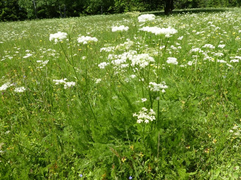 Meum athamanticum -- Bärwurz -- Doldenblütlergewächs, herrscht auf den Bergwiesen vor. Aromatisch duftend wird sie gern auf Butterbrot gelegt und gegessen. Als Viehfutter für Rinder der Ebene ungeeignet. Sie mögen den Duft nicht.