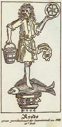 Die Darstellung des Sachsengottes Krodo aus der Sachsenchronik des Konrad Bothe aus dem Jahre 1492. Der Holzschnitt zeigt den Götzen mit den herausragenden Symbolen, die zu vielerlei Deutungen Anlass geben. Es sind dies das hoch erhobene Rad, der Fisch, auf dem Krodo steht, der wehende Gürtel und der mit Rosen gefüllte Eimer. Krodo soll von Kaiser Karl dem Großen gestürzt worden sein.